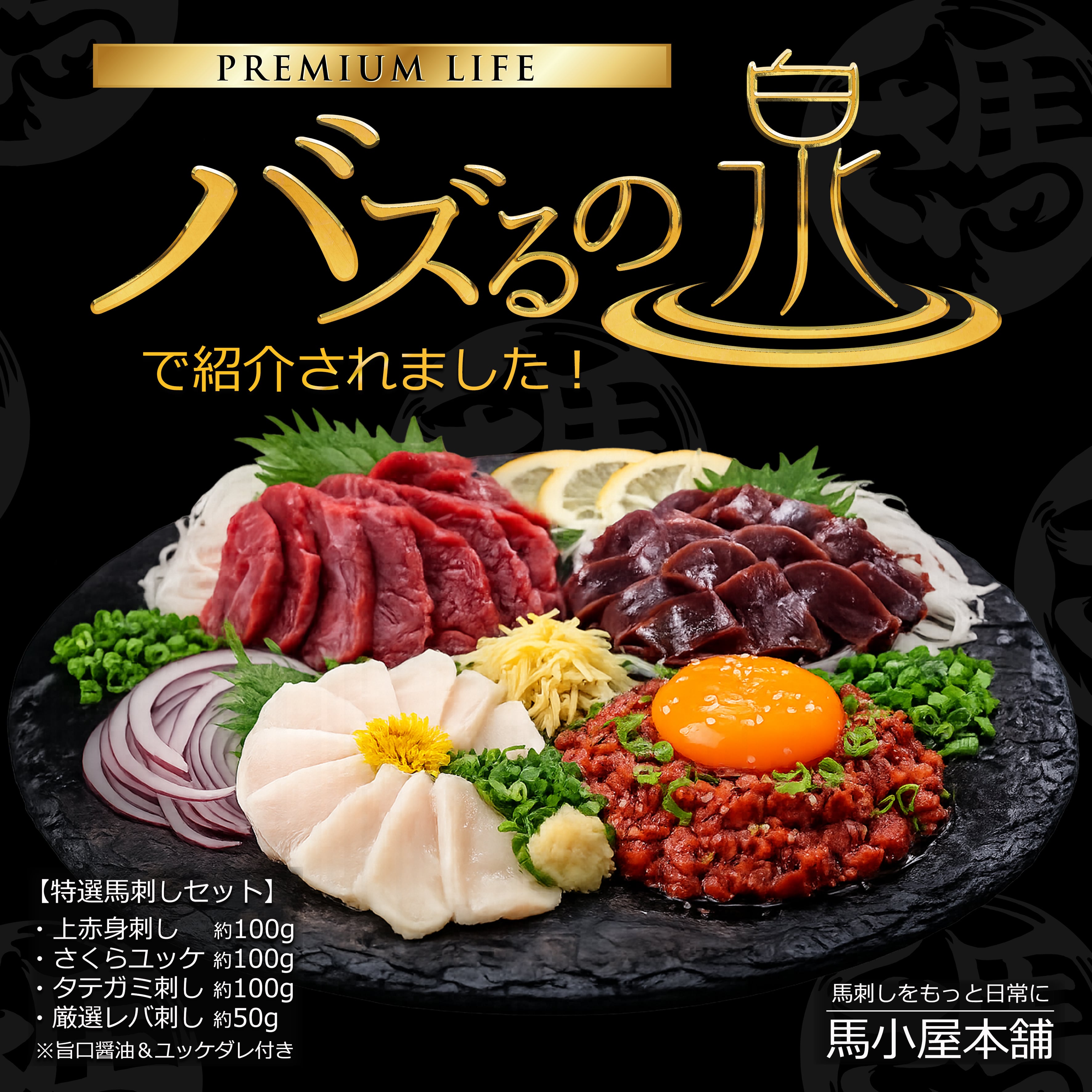 プレミアムライフ〜バズるの泉〜で紹介された馬刺しセットをついに馬小屋本舗で販売開始! 定番の上赤身をはじめ、さくらユッケ、タテガミ、厳選レバ刺しを約350g(6〜7人前)たっぷり詰め合わせました! ※旨口醤油、ユッケダレ、お召し上がり方付き ご自宅ではもちろん、贈り物としても最適なセットです!