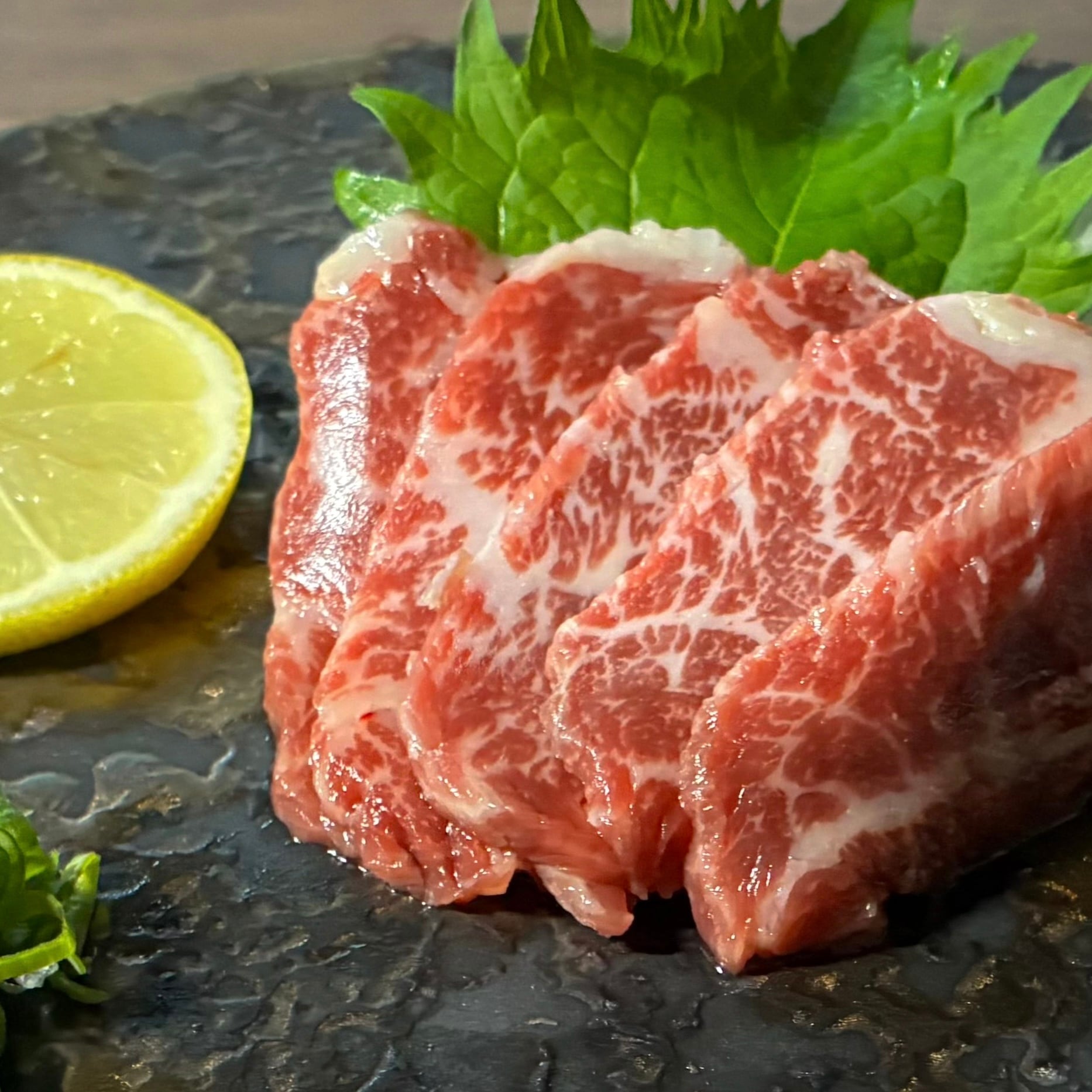 馬のハラミは横隔膜の部分を指し、内膜には綺麗なサシが入っていて脂の甘みを感じられ、外膜はブドウ色をしており、深い旨みを味わえます。